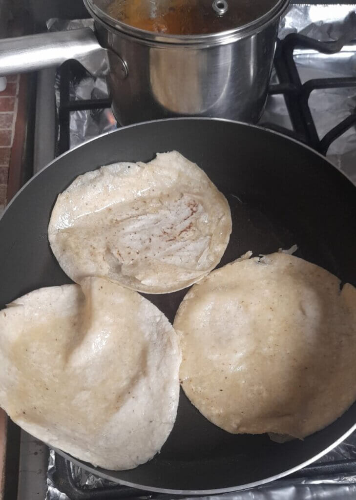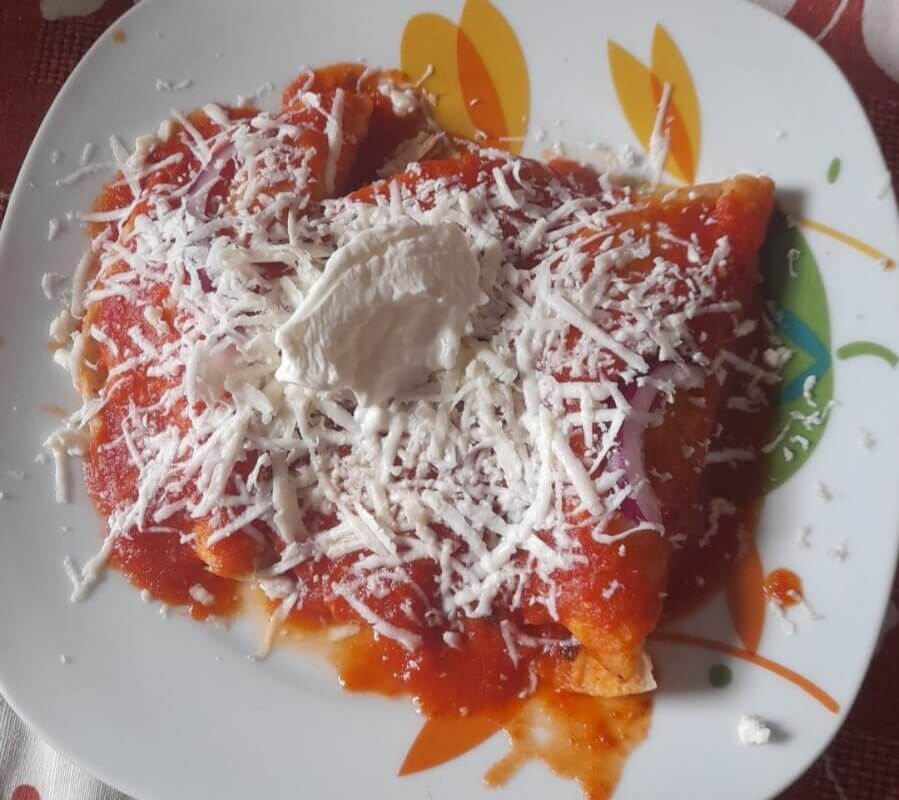 Se rellenan las tortillas y se bañan con la salsa de tomate, se agrega cebolla en pluma, queso y crema al gusto.