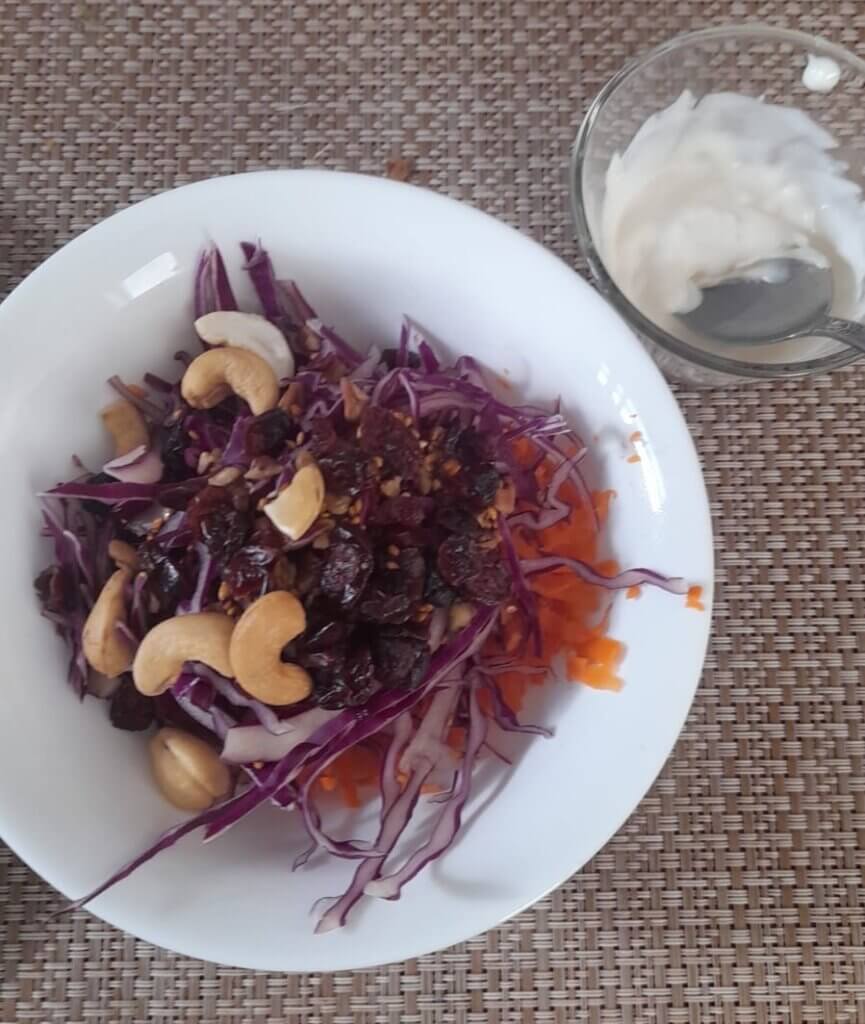 Pelar y rallar la zanahoria, desinfectar el trozo de col morada, revolver la mayonesa, la crema, sal y azúcar.